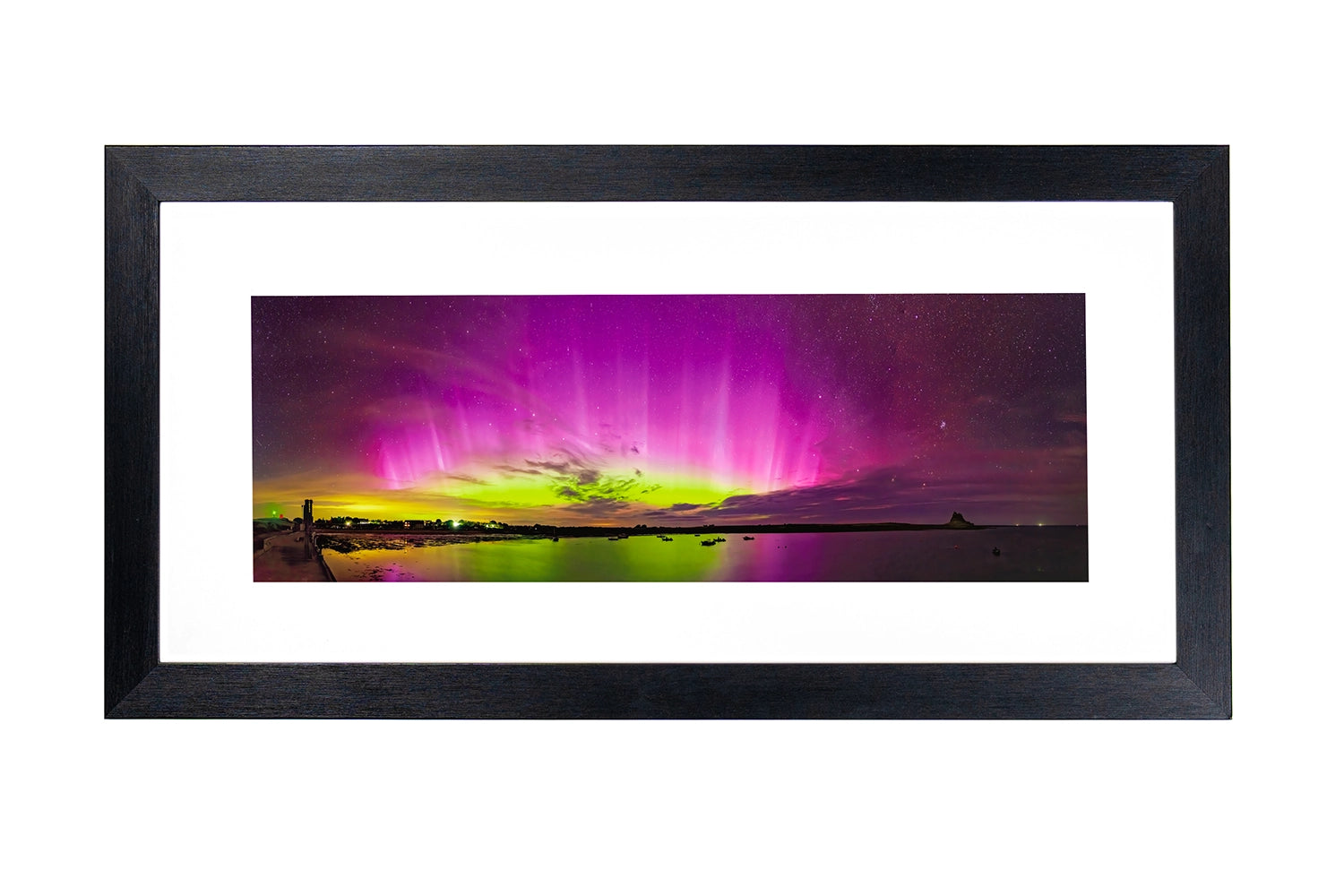 Immerse yourself in the celestial majesty of this "Holy Aurora" Panoramic print, where the Northern Lights dance dramatically above Holy Island's sacred silhouette. This extraordinary capture doesn't just showcase the vibrant aurora—it also reveals the twinkling Pleiades star cluster and the iconic Plough constellation, adding cosmic depth to an already breathtaking scene. The panoramic format perfectly frames this rare astronomical alignment, creating a piece that's both a stunning decoration and a window to the universe's wonders. Bring home this captivating moment where earth and cosmos unite in spectacular harmony.